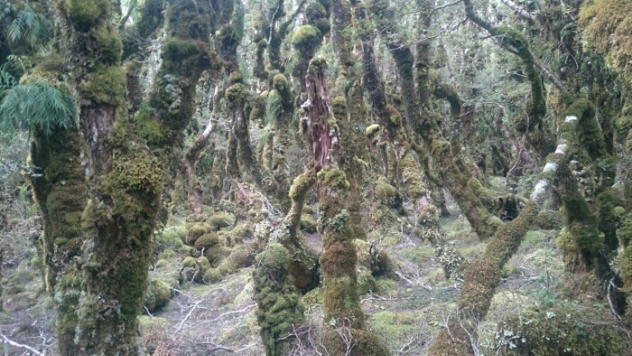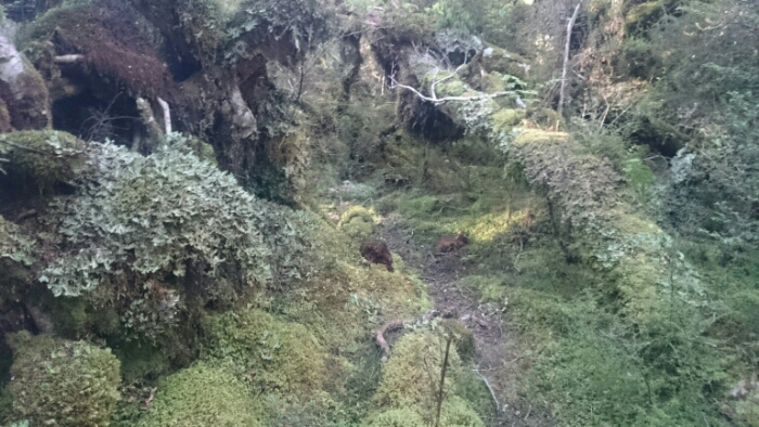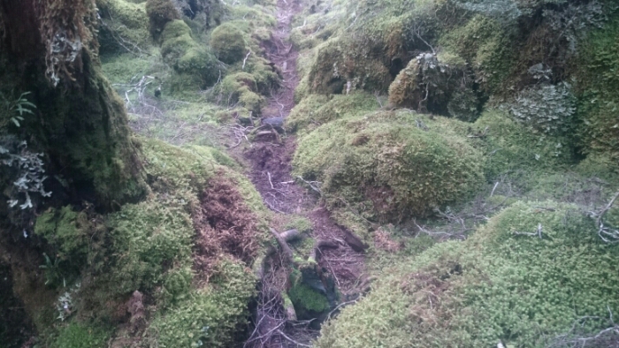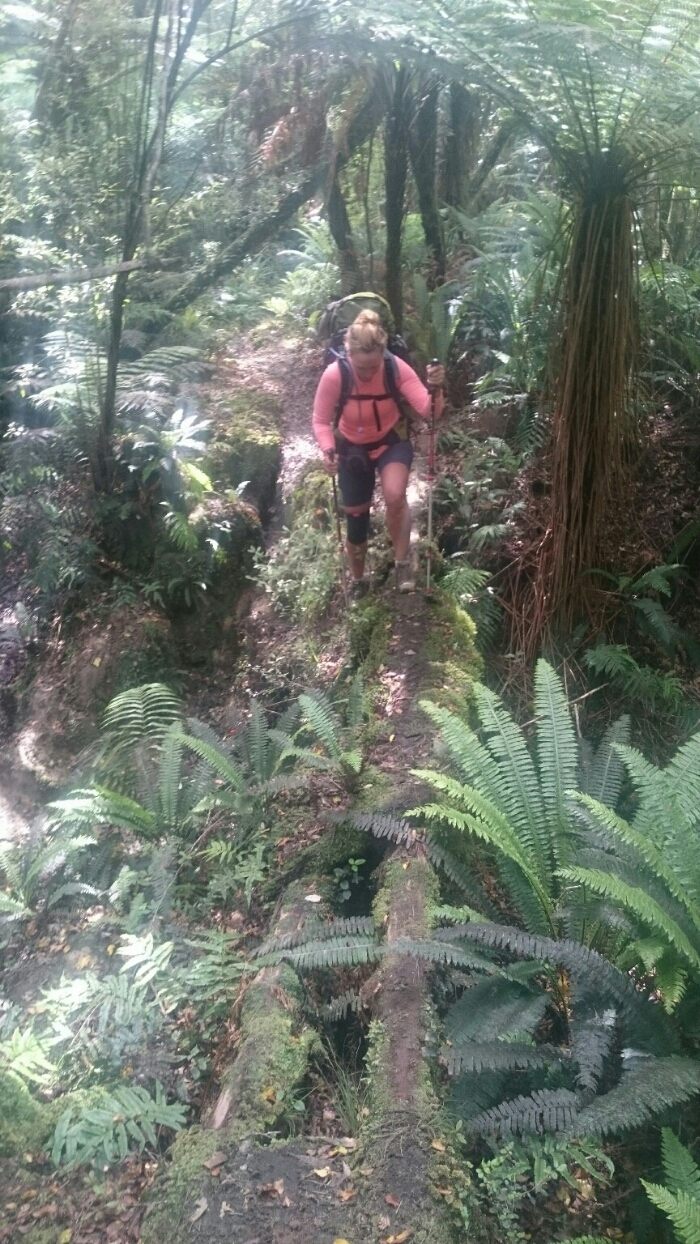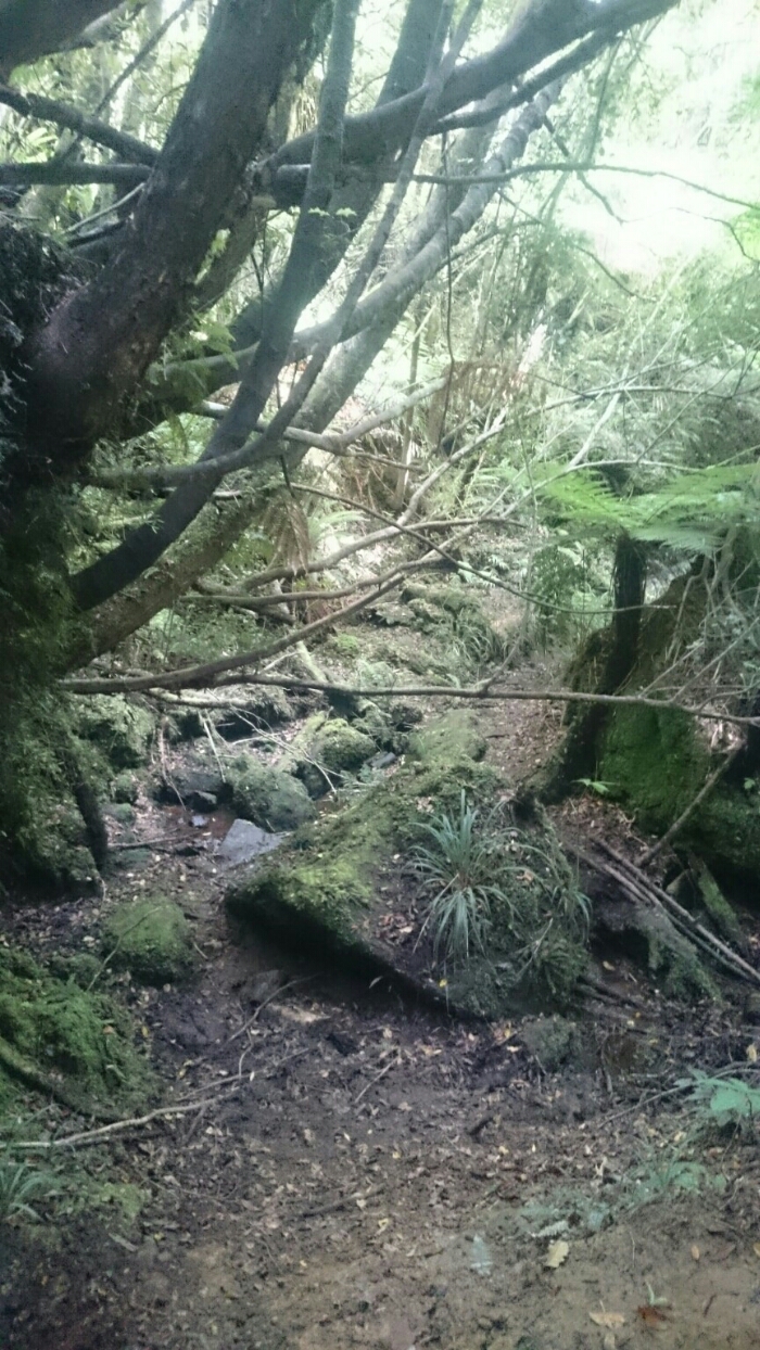 We hike in the morning sun to the next little peak nearby before descending in the bush to Martin’s hut. The old dried mud from yesterday is soon joined by fresh mud! But I don’t really care, the forest is wonderful and mossy and green.