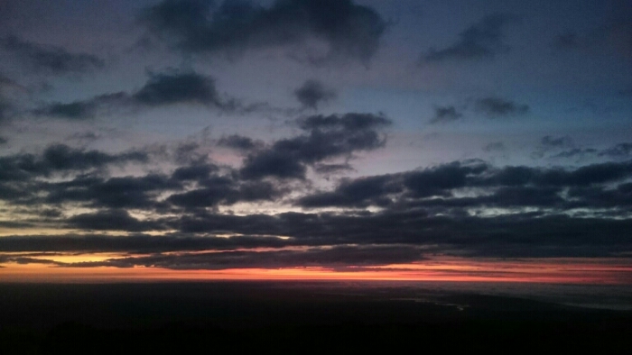 We get up at 6am for the sunrise. Cuddled up in our sleeping bags we watch the sky turn red and pink and beautiful while cooking coffee and porridge. There’s no better start into the day! We are completely dirty and muddy as we just carried some water for cooking and drinking, but there was no stream on the summit obviously to clean ourselves from the mud. And I couldn’t care less about being dirty when I see so beautiful nature!