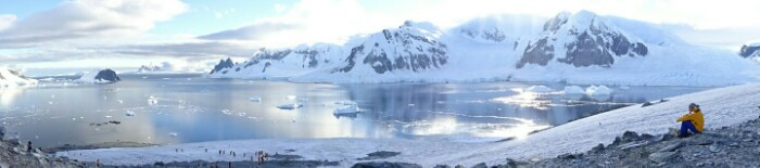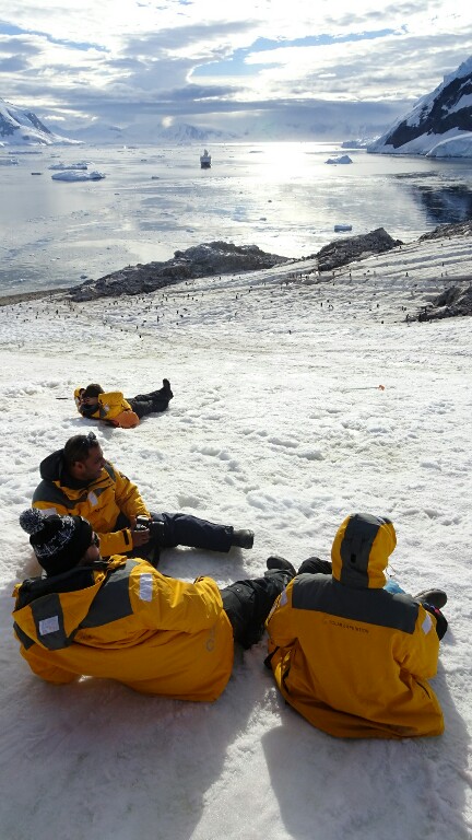 This morning my leopard group is the first landing on Danco Island. The sun is out and the sky is blue, in sharp contrast to the ice and snow. It’s the first time we get out really early with the sun and can hike up some hill for even more stunning views. I have a 360 degree view of the ocean, ice, mountains, snow, penguins, islands…