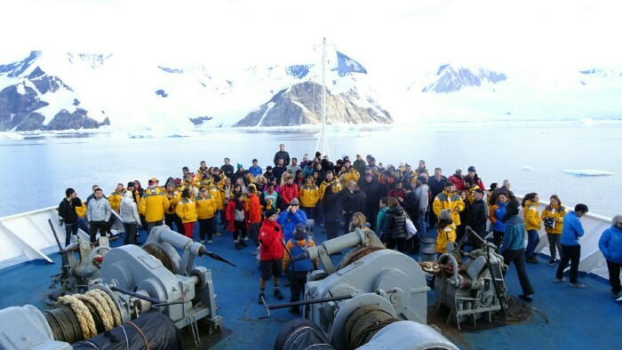 It’s then very hard to say goodbye and get back on the ship. Some crew members are out there in the sunset and trying kayaking or stand up paddling. It’s the last Antarctica cruise of the season and it’s nice to see how also the crew gets rewarded. All look forward to get back home after at least 3 months on the ship without any day off. We all gather for a goodbye picture before we have another great dinner.