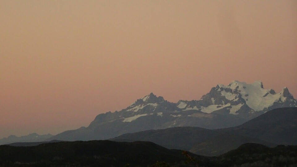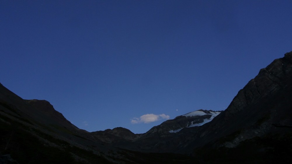 The rangers made everyone who hikes to Grey leave at 7am. Supposedly it will take 11h, but it’s only 14km and the pass is just at 1200m elevation – for me not such a big deal but many others are a bit scared… I get up at 6.15am, I didn’t sleep well and am awake before my alarm rings. Its still very dark, sunrise is just around 8am. But the rain from last night is gone and I can see the stars. I set out in the forest, trying hard to always keep to the trail, loosing it in the darkness is pretty bad. It’s much warmer than I expected and I am soon sweating. After an hour or so I am above the treeline, the morning light starts to appear but the sun will still take a while before its getting over the mountains. The trail is now easy to find and to walk, out of the forest there is enough light. It’s a perfectly clear sky and there’s no wind at all. I can’t believe how lucky I am again, usually it’s heavy wind and often rain, but I can now see the mountains glowing and admire the sunrise.