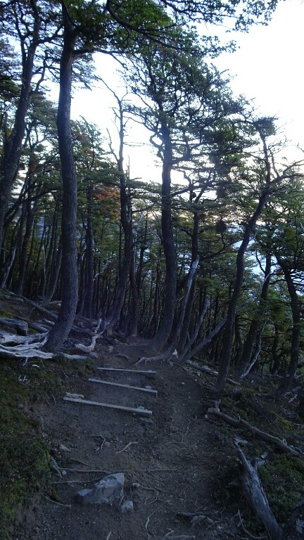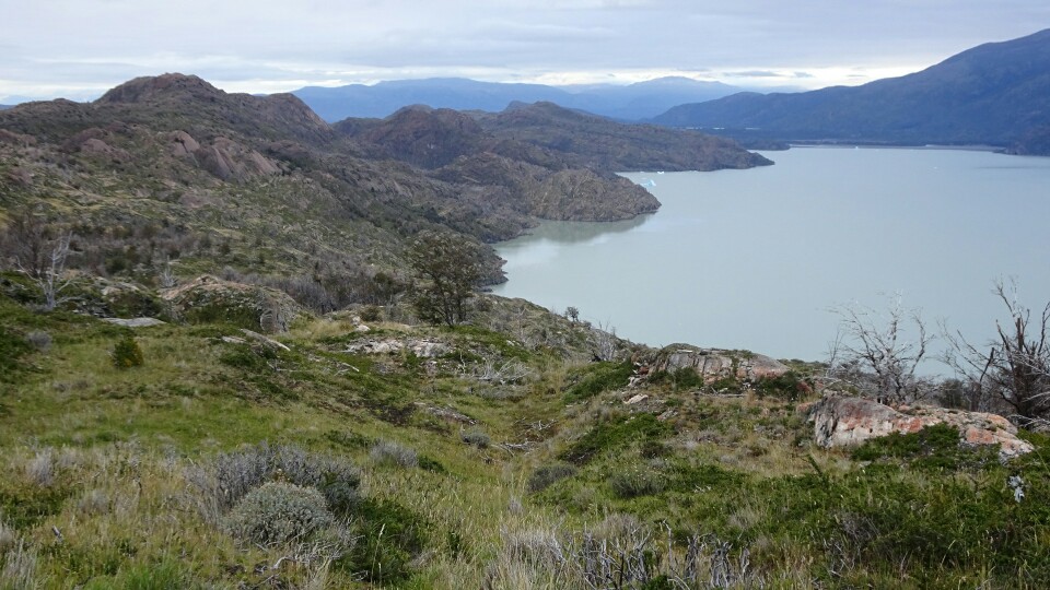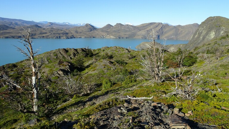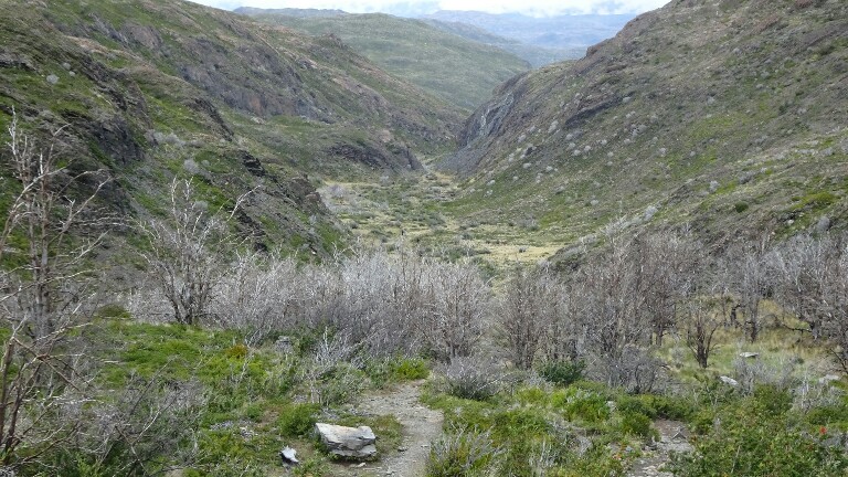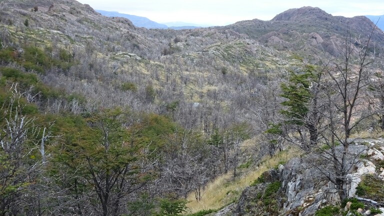 I hike through hilly terrain with dead trees. They were burnt in a big fire just a few years ago, its a shame what humans can do (accidentally but still…) to the nature. Coming the opposite direction, the Dutch couple I met in Puerto Williams, Puerto Natales and on the campamento Centrale. We have a chat, they also plan to go to El Calafate and El Chaltén next.