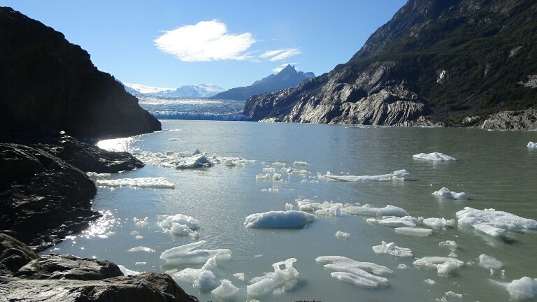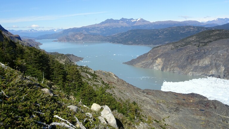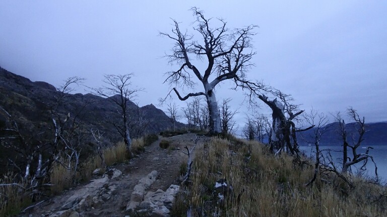 I can hear the glacier ice cracking off throughout the night when I wake up. Today I am leaving early again before 8am, still in the dark foggy morning. The trail to Paine Grande and then Camping Italiano will be easy. The first hour takes me along Laguna Grey with nice views back to the glacier.