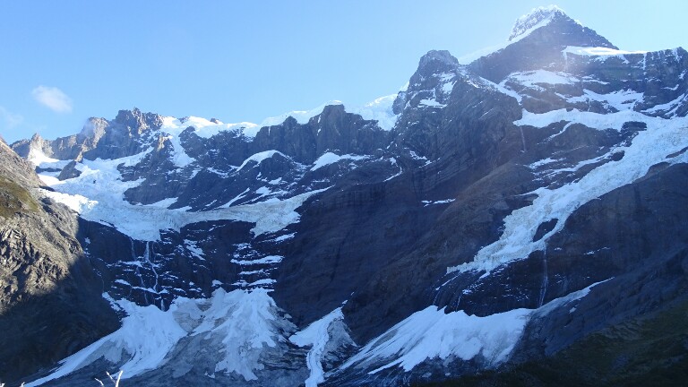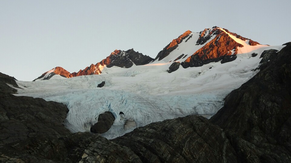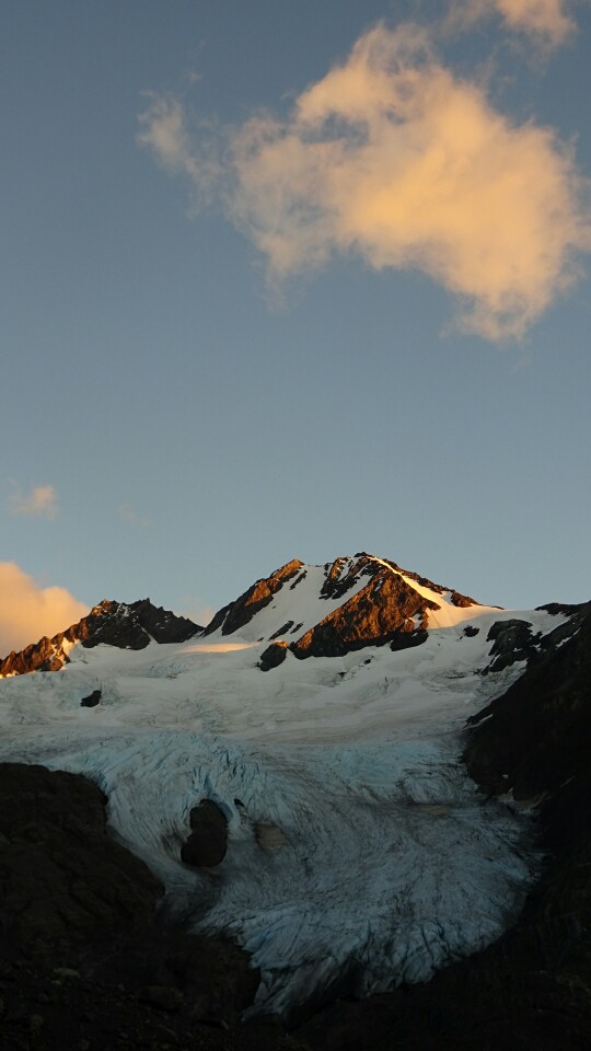 The rangers made everyone who hikes to Grey leave at 7am. Supposedly it will take 11h, but it’s only 14km and the pass is just at 1200m elevation – for me not such a big deal but many others are a bit scared… I get up at 6.15am, I didn’t sleep well and am awake before my alarm rings. Its still very dark, sunrise is just around 8am. But the rain from last night is gone and I can see the stars. I set out in the forest, trying hard to always keep to the trail, loosing it in the darkness is pretty bad. It’s much warmer than I expected and I am soon sweating. After an hour or so I am above the treeline, the morning light starts to appear but the sun will still take a while before its getting over the mountains. The trail is now easy to find and to walk, out of the forest there is enough light. It’s a perfectly clear sky and there’s no wind at all. I can’t believe how lucky I am again, usually it’s heavy wind and often rain, but I can now see the mountains glowing and admire the sunrise.