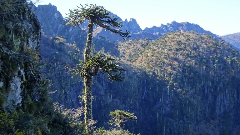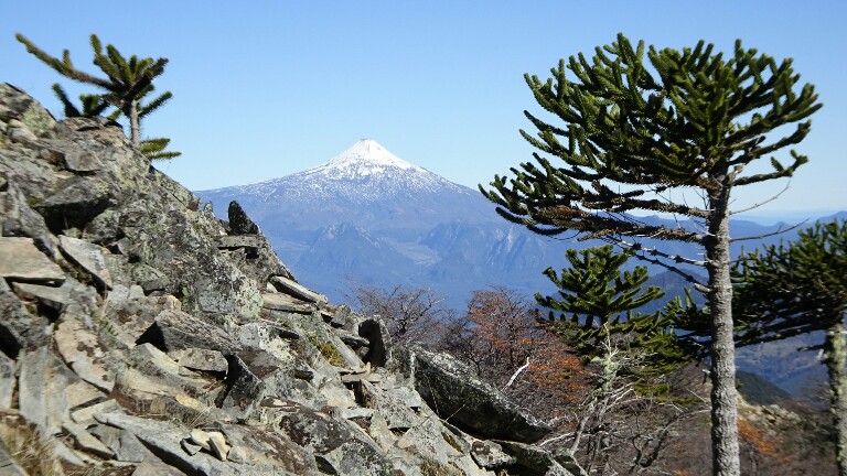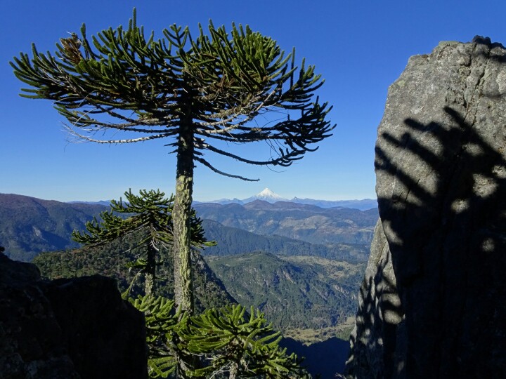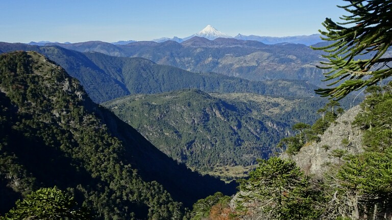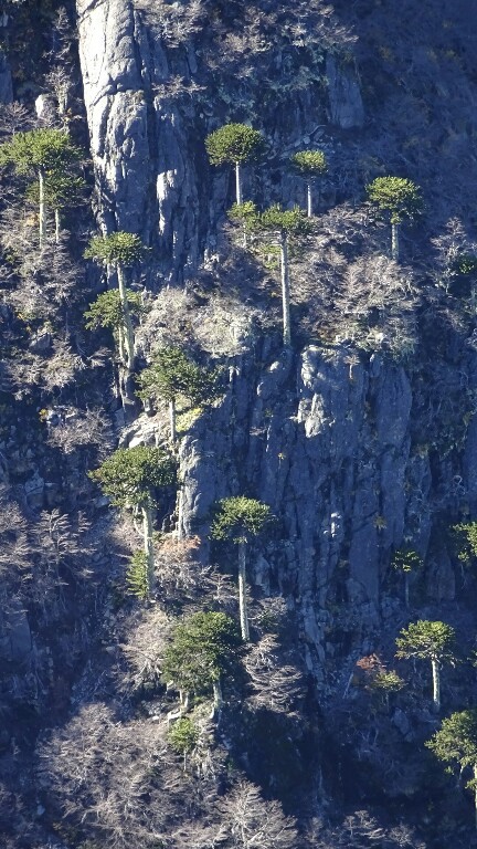 After the first 4km I get out of the forest at a flat area and can now already see some volcanoes. Now the trail is getting really beautiful, amidst lenga and arakauria trees, rocks, steep drops and great views I make my way further up. The good thing about the trail being officially closed is that there are no other hikers, I am just on my own. There was no sign of the trail being closed and I don’t see why it would be.