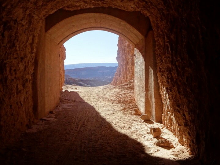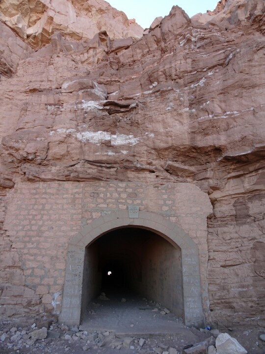 Then we bike uphill to the “túnel”, not sure what to expect, a real tunnel? The view is just stunning anyway, crystal clear blue sky, red hills, green valley and the backdrop of the high volcanoes. But not used to the altitude and with the sand, we end up pushing our bikes uphill until we find the Túnel, it’s a real tunnel and we push our bikes in the dark to the other side, not as spectacular though. Then it’s time for the nice part, riding our bikes downhill back into town.