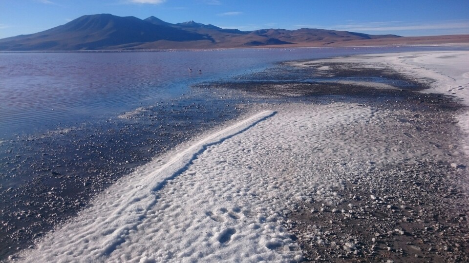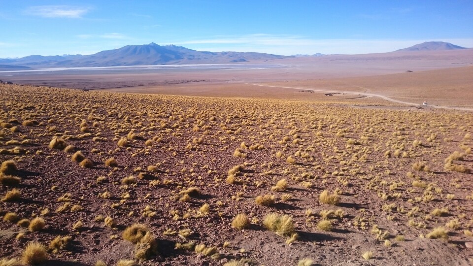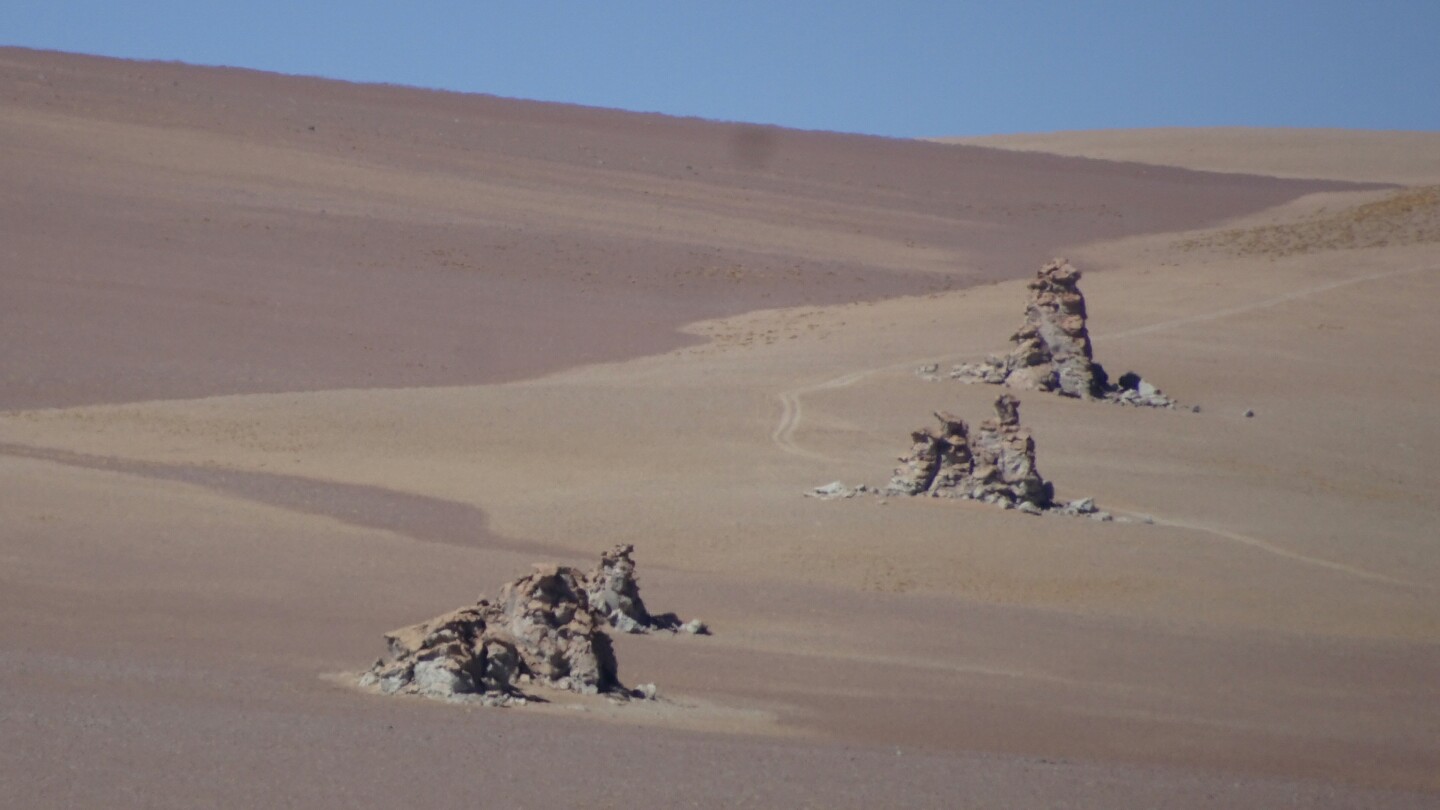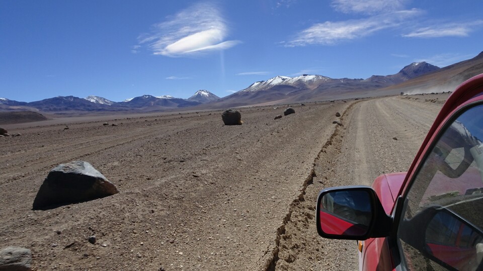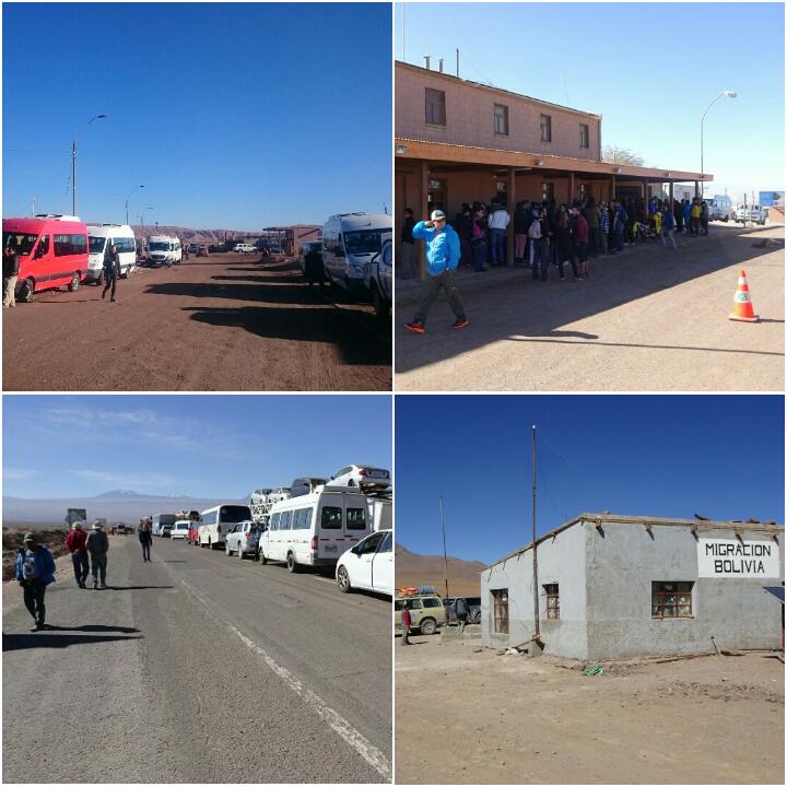 I am ready for my 3 day tour into Bolivia, via the salt flats of Uyuni (and many other highlights). I have seen most of the sights in San Pedro and feel acclimatised after some high altitude excursions. I am picked up as the first one around 7.10am, we drive around and get 5 more people. My group for the next days is composed of 2 French girls, a Swiss who lives in the UK, a Brazilian and a Spanish (the only one not talking much English). I am happy, there is someone to translate for me as the Bolivian driver will only speak Spanish (having an English speaking guide is double the price). As it’s low season we got the trip for 90,000 pesos each, all food and accommodation included. We are not getting far though in the early morning, the immigration office (for our exit of Chile) is in San Pedro. We arrive there at 7.40am but it only opens at 8am. At least we are one of the first in the queue (the van queue, the drivers are queuing up for us to avoid a mess). After 8am we are informed that the road is closed due to snow and ice, we have to wait here until 10.30am. So we wait, have a good breakfast outside the van, enjoy the sunshine and wait. It’s not really a security issue, we are told it’s more about politics. Well, if I’ve learned one thing on my trip it’s to be patient, relaxed and just accept how things work here. It’s also easy to be patient if you have all the time in the world, it’s more difficult if you work and have to deal with all the stress of daily routine. I still hope to remain relaxed for a while when I am back home! It’s 11am when we are finally through exit border control but then some more waiting at the actual road closure. A half an hour drive later we are finally at the Bolivian border in the middle of nowhere, for a quick immigration and changing from the van to a jeep with our Bolivian driver Marcello. There hasn’t been any snow, our driver assumes the police was just lazy today…