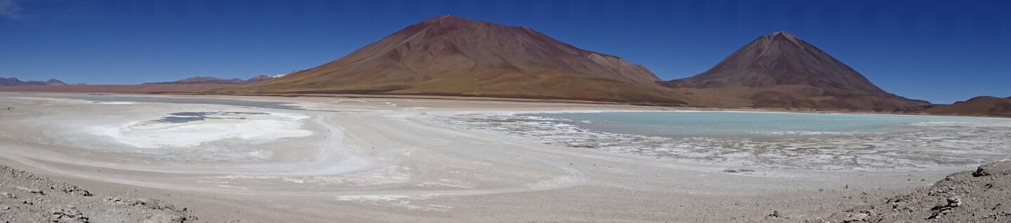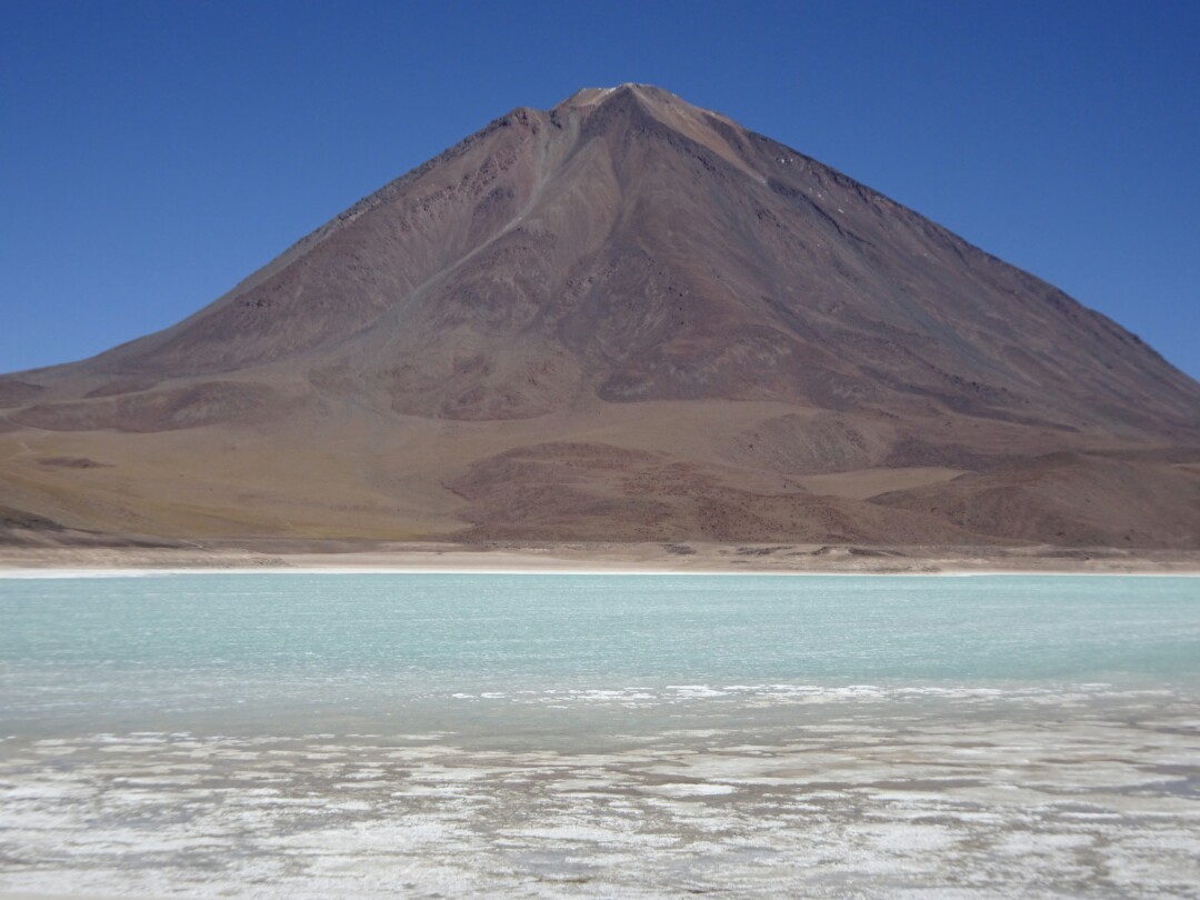We drive off on the dust road to the Laguna Blanca, which is only 40cm deep and frozen. We are still inside the huge Atacama desert and now in a national park for which we paid an entrance fee. A bit further, the more impressive Laguna Verde, the colour is fascinating and the backdrop of the Licancabur volcanoe (now seeing it from the other side) provides for an even more spectacular view.