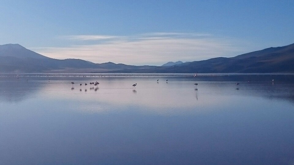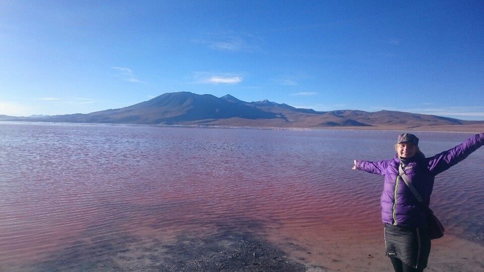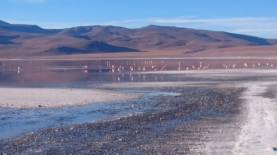 That’s a real shame as our final stop today is at the Laguna Colorado, the most colourful lake I have ever seen. It’s red and yellow and blue and plenty of flamingos are walking around. But now I only have my phone to take pictures and the flamingos are too far away. I try to tell myself that the memory and having been here is more important than pics, but it’s hard 😉