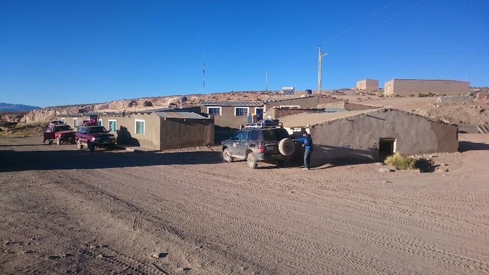As we are late we cannot drive to the last lagoon. It’s another 2h to Villa del Mar, and the hostel where we are staying tonight at 4000m altitude. The sunset is beautiful but the last 30 minutes we drive in the darkness on the bumpy dust road. Timezone has changed by one hour, meaning the sunset is now very early at 6.30pm… The hostel consists of small rooms, I am sharing a 4 bed room with the guys while the French girls share a double bed. Bathrooms are outside and it’s quite cold, I am happy about having my sleeping bag. Dinner is a soup followed by pasta with some tomatoe-onion mix and luckily we get some crackers afterwards because the portions are very small. Alberto, the Spanish, isn’t feeling well, he cannot eat and has a headache, the altitude effect. I can feel the altitude but I am OK, it’s not too bad. We go to bed very early, I am tired and want to be fit tomorrow.