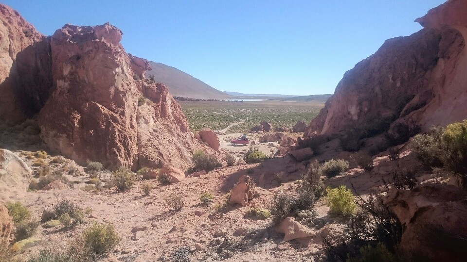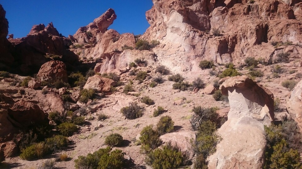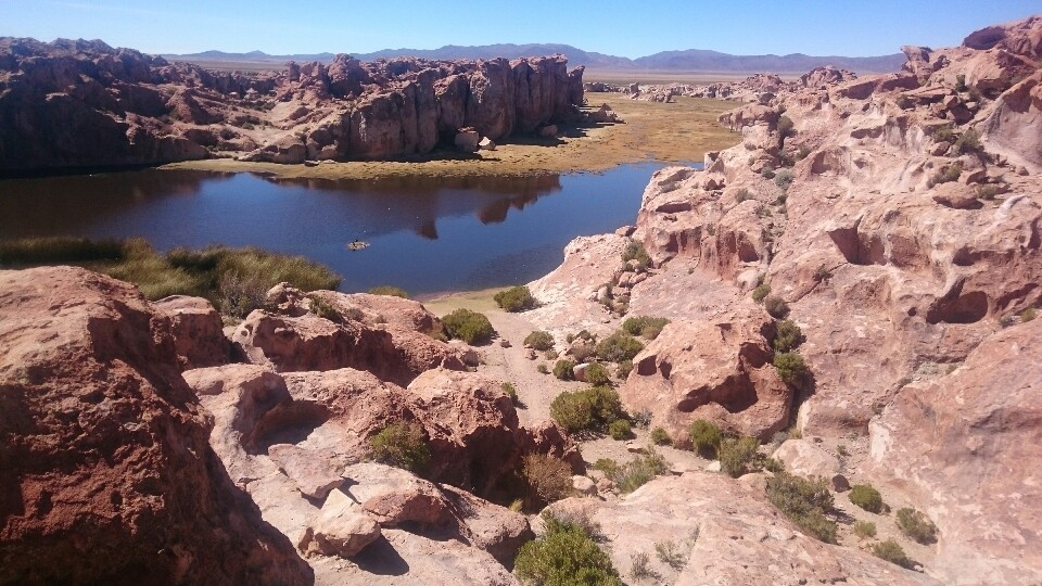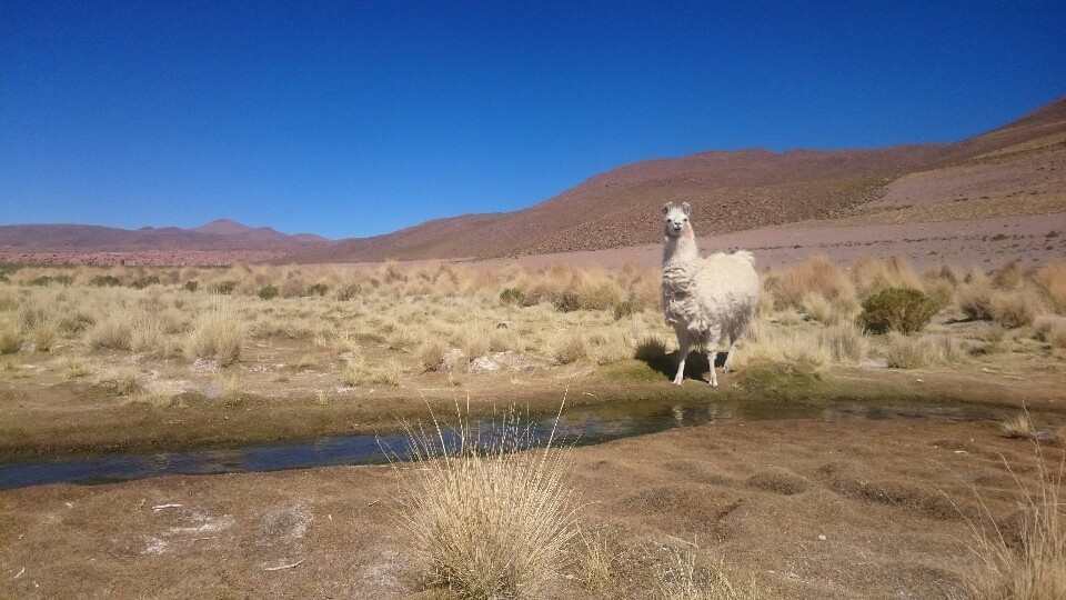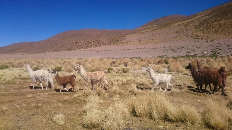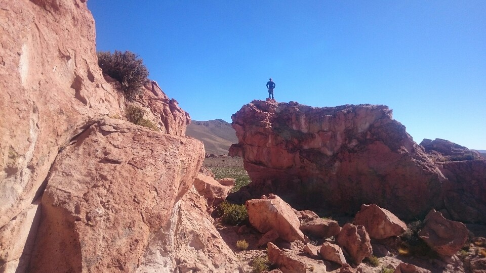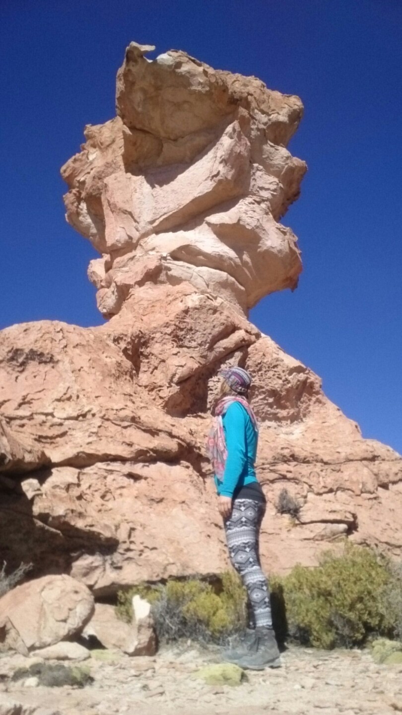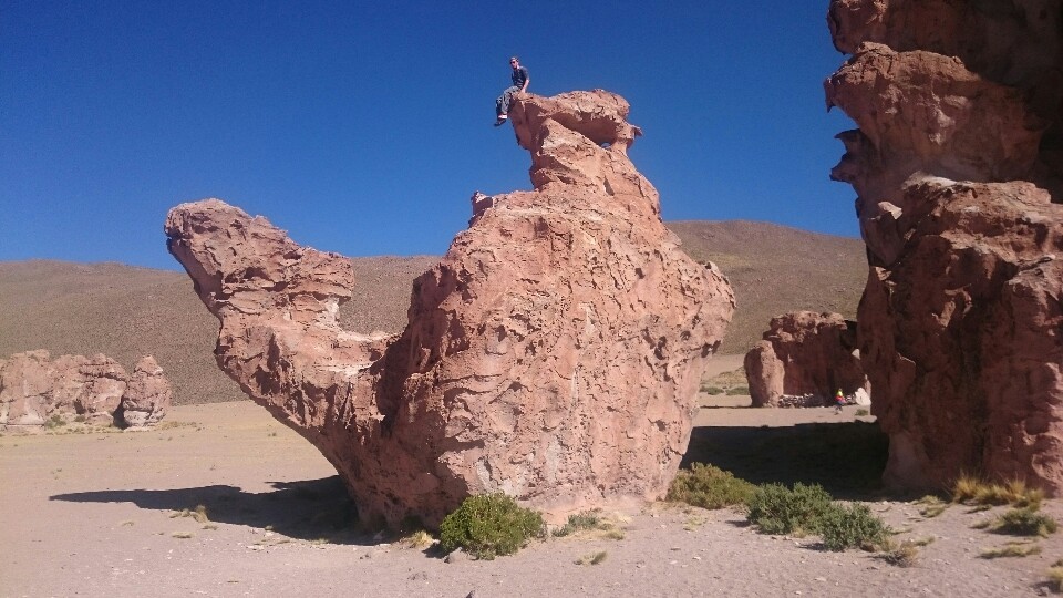 We continue to a lake with flamingos and Lamas, then some volcanic rock formations, forming the world cup, a camel and the lost city. It’s great to climb on some of the rocks, enjoying the view of the red rocks, the interesting forms and the vastness of the desert.