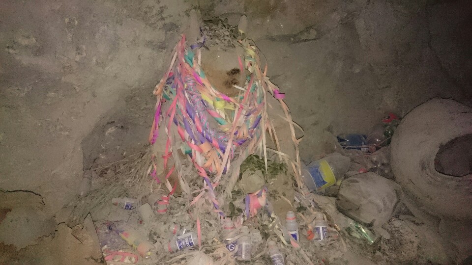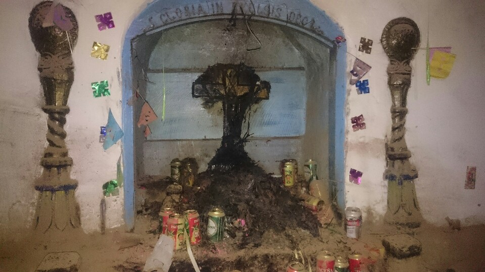 Already when entering the mine I feel scared. It’s just high enough to walk but then you have to run or jump to the side when a chariot passes by, weighing 2 tons if filled and pushed by 2 small Bolivians. The noise is so loud you cannot talk. The guide shows me the devil, el Tio. Every section has a devil to whom they bring cigarettes, coca leaves, alcohol for good luck. They are scared, there are so many dangers and God seems to far away inside this mountain, inside the hell so it must be the devil that can protect them if they make offers. There’s also a small shrine, a stop there at the beginning of every shift is also mandatory.