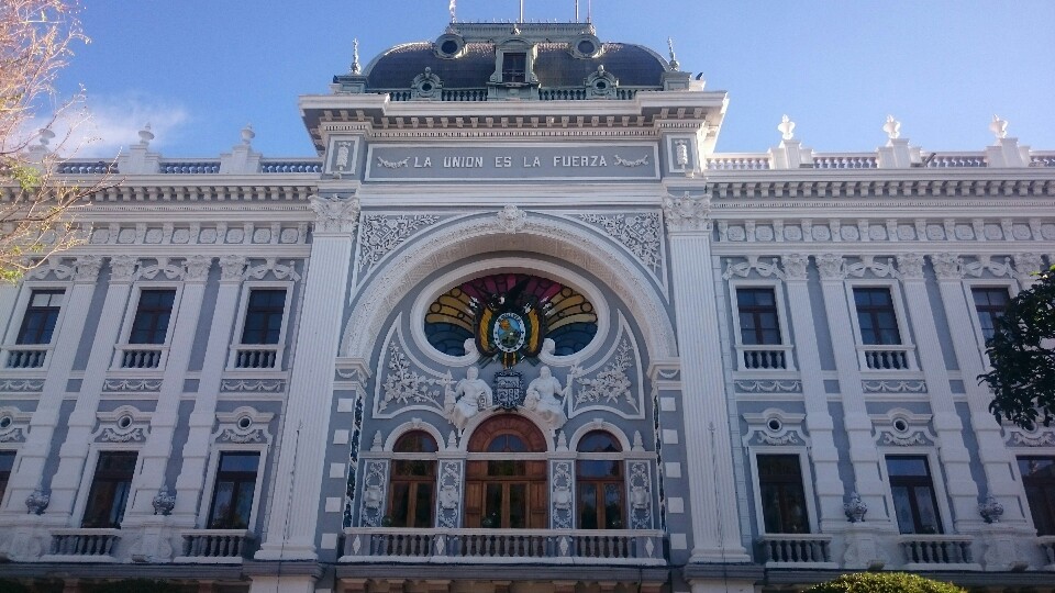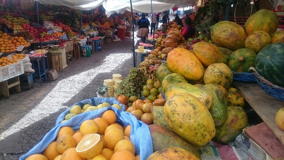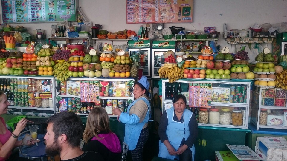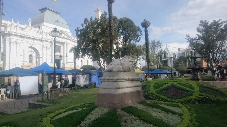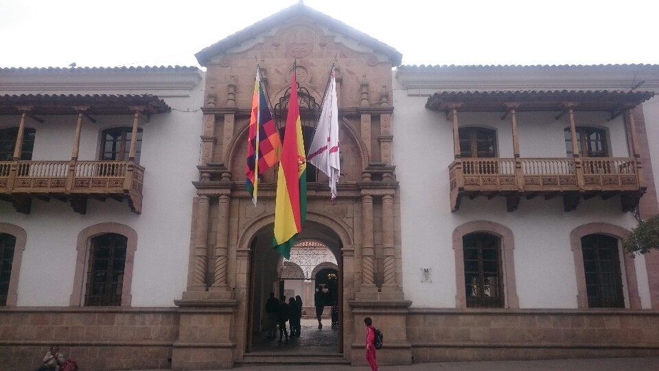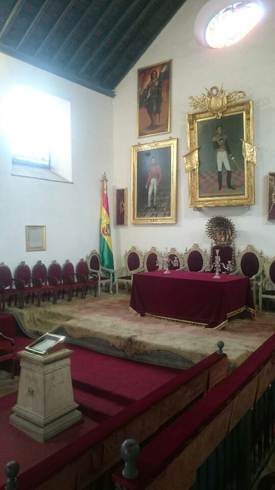 Another fruit juice at Lesley’s place and we try again the bus for the second tour. But now all the buses are completely full, school ended and we just cannot get in a bus. OK, we decide to hang out further instead, just enjoying to walk around the market, the town, have a coffee before taking a guided tour of the Casa de la Liberdad. Interesting history about Bolivia.