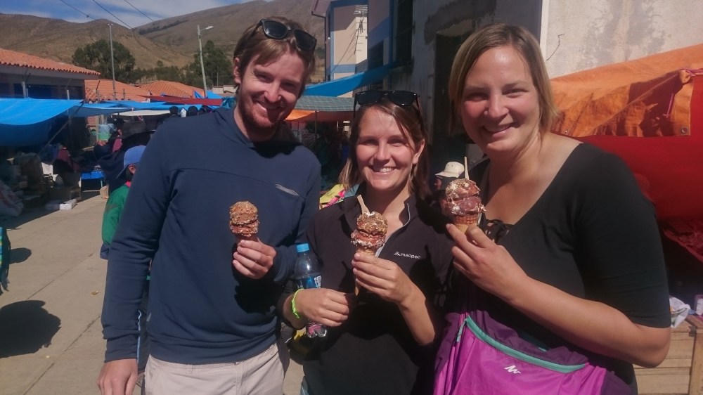 Arriving in Sucre in the evening I only make it to the hostel and sleep. I am really happy to meet Chris and Mim again, having booked the cozy hostel Beehive as I knew that’s where they stay. In the morning an early breakfast is already arranged as we want to catch the bus to Tarabucco, a town about 90 minutes further away with a nice Sunday market. Somehow we miss the tourist bus but taking a local minibus is anyway cheaper and as nice as so many people of our hostel are going that 14 of us fill up that whole bus. After speaking French the last two weeks I switch back to English with the many girls of the hostel. A lot of Backpackers stay in Sucré a while to learn Spanish, it’s cheap and the town is really beautiful.