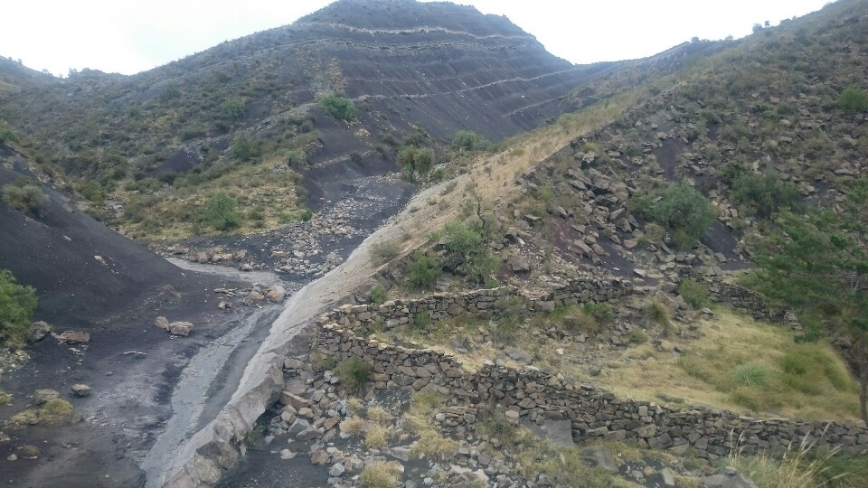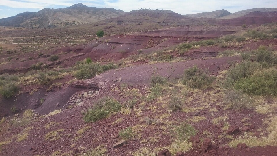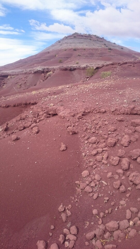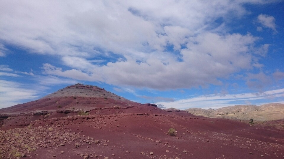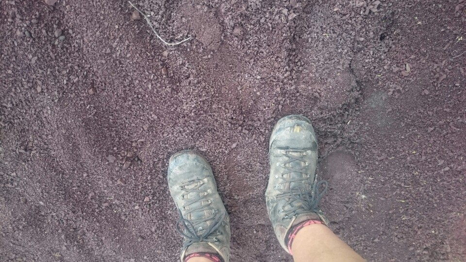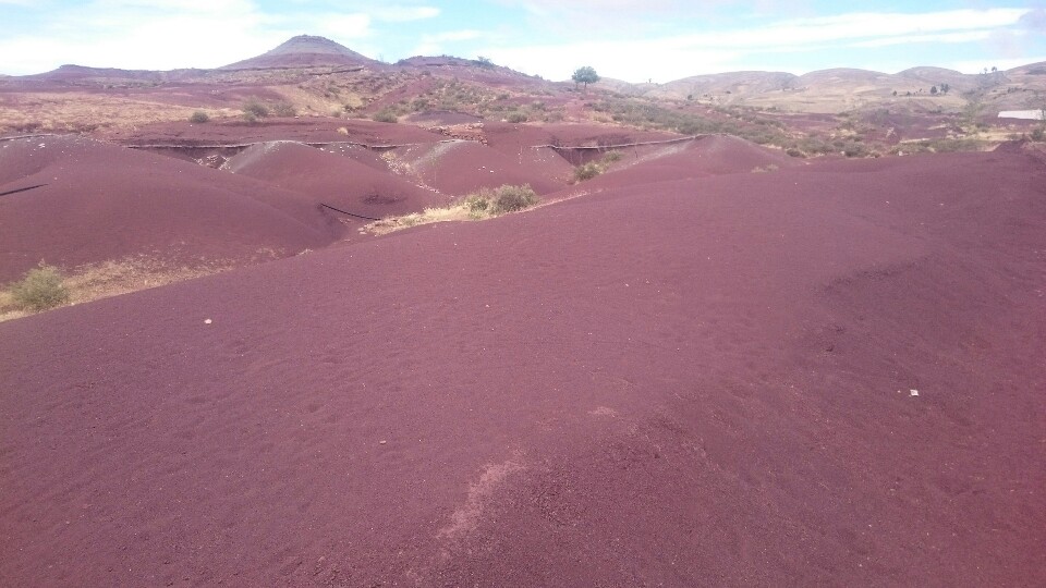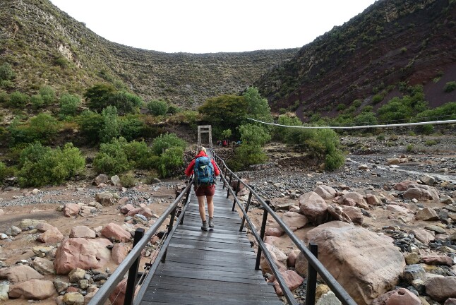 Now we can cross that hanging bridge, it’s not quite straight but not scary as I thought initially. We follow the group down to the river and then up the hill. A trail is leading through a very different landscape now, after the red hills and green plants, it’s now black rocks and some kind of terrace cultivation. And then we are walking on “red sand”, over a ridge and again red and black coloured hills. It’s magical, just incredibly beautiful, out of earth.