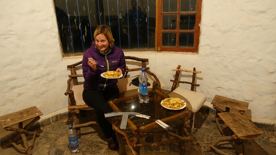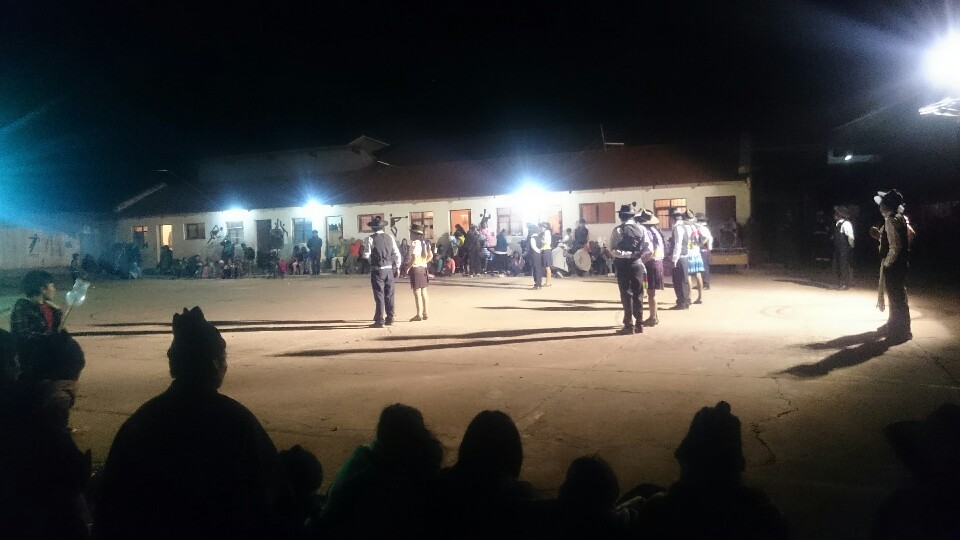 The first hostel is closed and we continue along the school till the end of the road, then turn around. An Israeli couple catched up and tell us there’s another hostel down the other road (the village is so small!). And here is the “shop” where we can buy some water, just a little room with water, beer, crackers (incredible, MapsMe marked even this with “muy pequeña tienda”). On the other road, the couple asks at the hostel on the left, they have only 3 beds left. On the right, they have like a little house left with a small kitchen / sitting area, 2 bedrooms and another room with beds. The Israeli prefer to go back to the other hostel, we don’t have another choice than staying, for a reduced price of 50 Bolivianos including dinner and breakfast. I like having a lot of space but it’s not really clean, luckily we brought our sleeping bags. Oliver doesn’t feel comfortable at all. We are happy to see other hikers and talk with them until they get dinner served by their guide and he wants us to go. Our dinner is served in our house, by an old lady with black teeth. We were a bit hesitating about whether we should eat here, if it’s safe, especially as the guide cooked himself. We brought food and a cooker. But the soup seems OK and tastes good, the main dish of pasta, potatoes, vegetables and (probably the problem) eggs also. The festival for the 25 may seems to be ongoing in the courtyard of the school so we walk there with our headlamps, it’s dark now and there are no street lights. I don’t feel at ease but luckily we are two and so I can just follow Oliver into the courtyard. In the middle, every class of the school seems to have a few minutes for a dance, a theatre play,… The other inhabitants are sitting around and there are also some other gringos like us, two groups with their guides. The sound quality of speakers is really bad but I enjoy watching the dances. For the rest we don’t understand a word. So we leave again soon and have a rest.