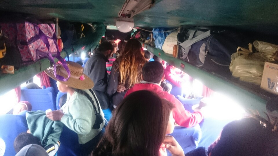 So we start in the morning with the taxi to take us to the specific bus station Parada à Ravelo. Seems my Spanish pronunciation was not good enough as we end up somewhere else, then the taxi driver finally gets it and brings us to the right place. We are late, it’s the 24 May and Sucré is celebrating its birthday (which is only on the 25 but for some reason they celebrate the day before), so streets are closed for the parades. We make it just in time. Luckily I even got explained where exactly the bus starts as upon arrival some people want to convince us that the bus already left and we have to take a taxi (for a lot of money of course). The real bus is about to leave but when we tell the man at the little ticket hut that we want to go to Chataquila he shouts “Dos gringos mas” and we can get in the already crowded bus. Two Israelis are already there, I know one of them from Bariloche. Also with us chicken, stored in the overhead compartments.