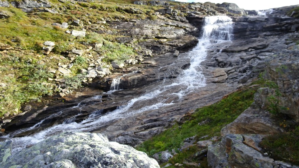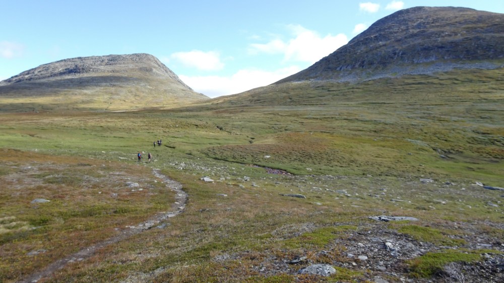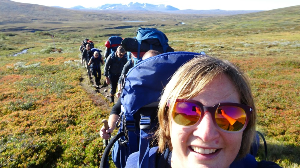 Then it’s up to me and my tent mate Patricia to be the leaders. As Patricia has a foot problem she stays at the end and it’s my turn to lead. What can I say, it’s the first day where we are only walking on trails! That’s my core skill, no problem. All four groups are anyway quite close together today. The view is fantastic, blue sky, green and colourful plants, reindeer every now and then.