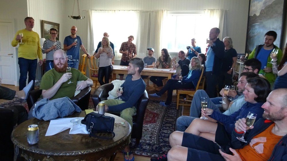 At 6.30pm time for champagne and a slideshow with all pics from the trip, followed by an incredibly good dinner. We are handed over certificates and get hugs from everyone before sing a traditional Jåmtland song for us. Such a wonderful atmosphere with these warm hearted people. Then we gather for some more gifts, they are just incredible! All of us get some small item from the brands (I get another tube from Woolpower) and I win some chocolate for my nature pic on Instagram. Three people are drawn like a lottery for the big gifts, a backpack from Lundhags, a thick downjacket from Klättermusen and a tent from Hilleberg. I am not lucky, but wow, amazing gifts, so generous! The evening ends late with drinks and a lot of fun but I am too tired to stay till the end.