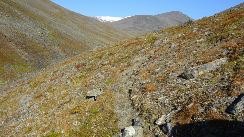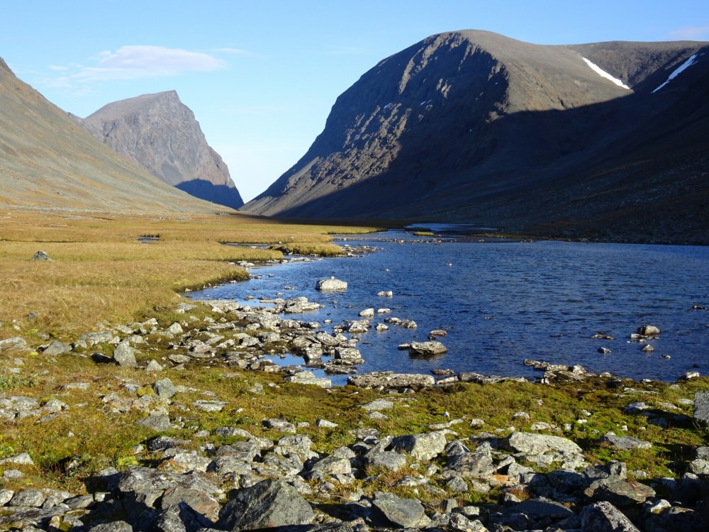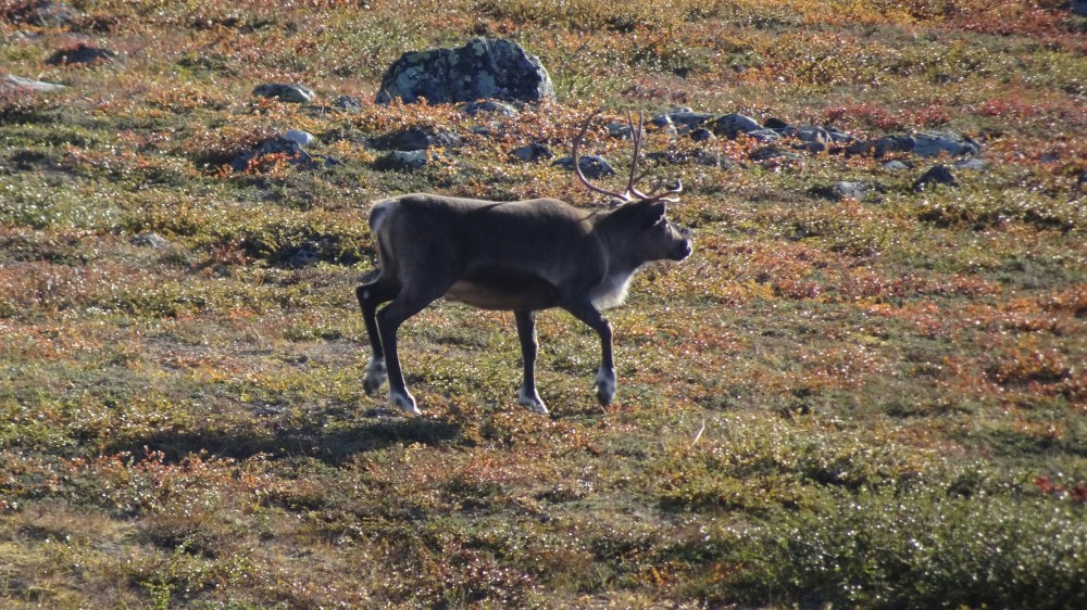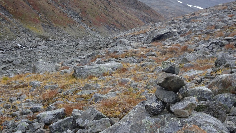 The afternoon gets really hot, I can walk just in my shirt and enjoy the view. Not such a strong wind as yesterday. Just after the bridge, as marked on the map, I find a trail and even though it doesn’t have official red marks, it’s quite obvious and later when hiking on rocks there are plenty of stone pyramids. The view gets better and better as I hike up along a river. I run into another reindeer and then need to climb a little on rocks. Yeah, this is now what I really like, the trail has been a bit too easy so far.