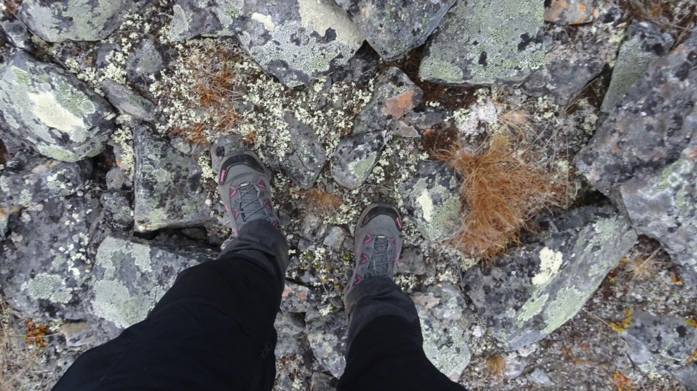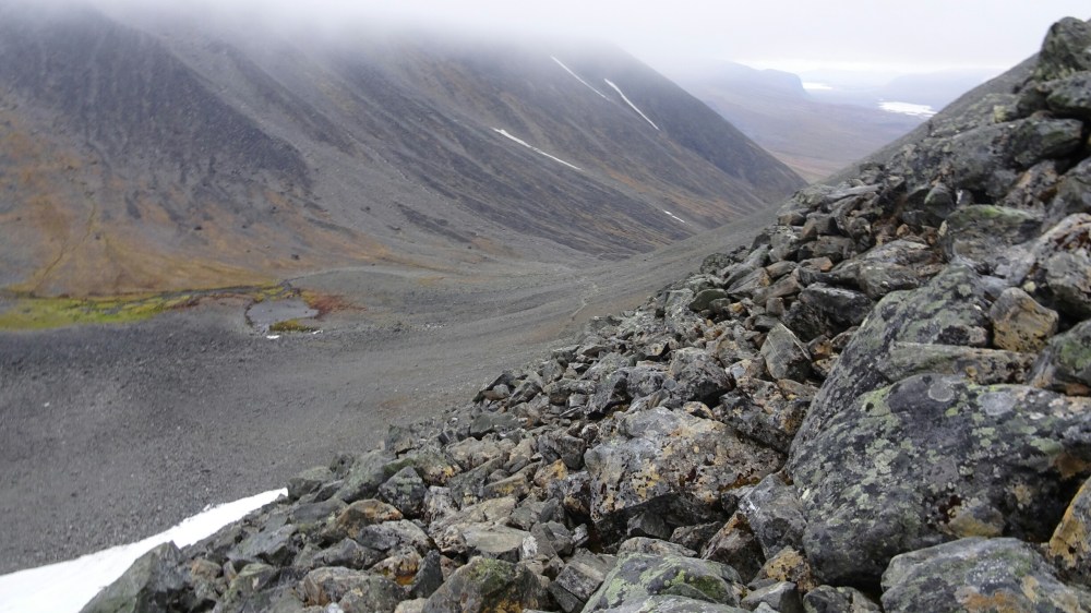 I am trembling from the cold but the lower we get the warmer I get. We meet a few people hiking up and talk to them about the situation. Most continue to the hut. After the first part downhill, it’s again a stretch uphill. So difficult to judge in the fog how far, it seems endless and it gets colder again. I am the only one hiking with my full backpack, the others left it at the Fjällstation. Once on the top it’s still a long way down against the wind but scrambling on rocks with my blistered feet.